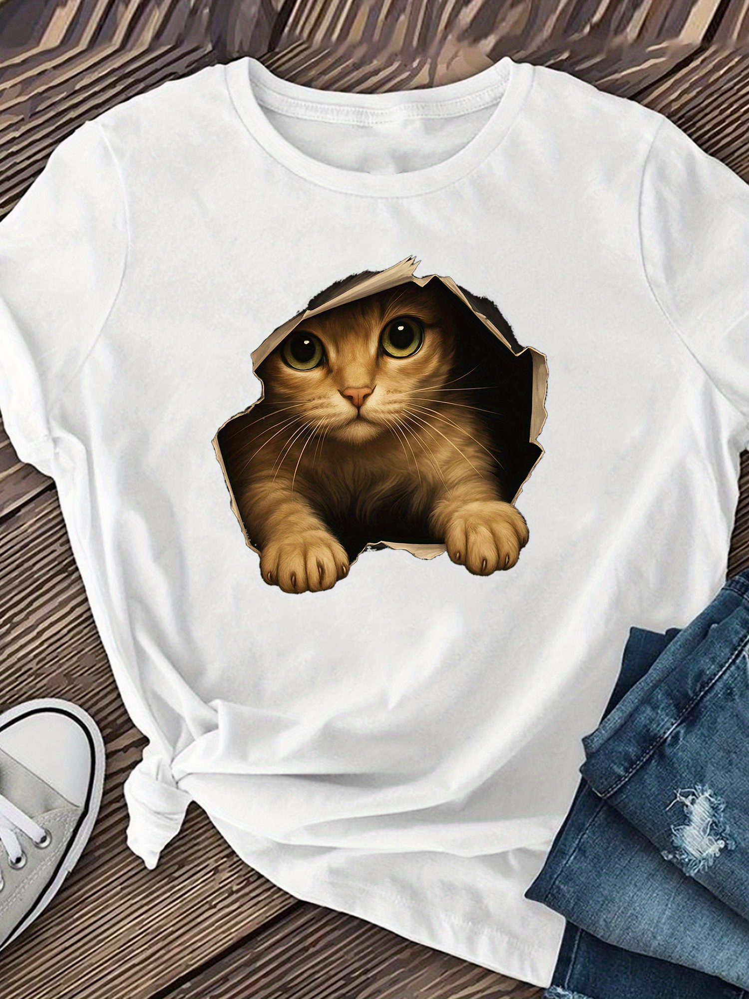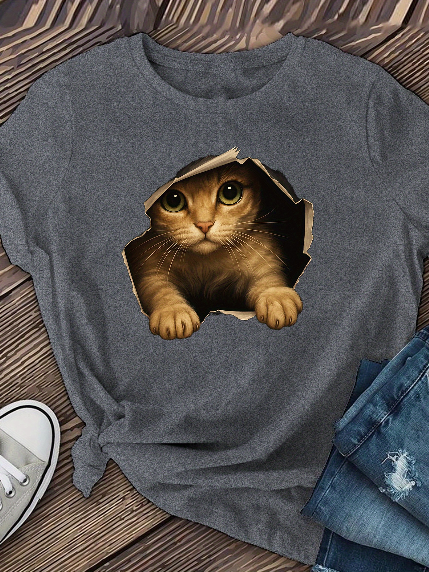 [Cute Orange Kitten T-Shirt] Lightweight Comfortable Fit Women's Cute Orange Kitten Peeking from Torn Hole Graphic T-Shirt - Red Casual Everyday Tee for Pet Lovers - Medium Elasticity Fabric Spring Summer Apparel