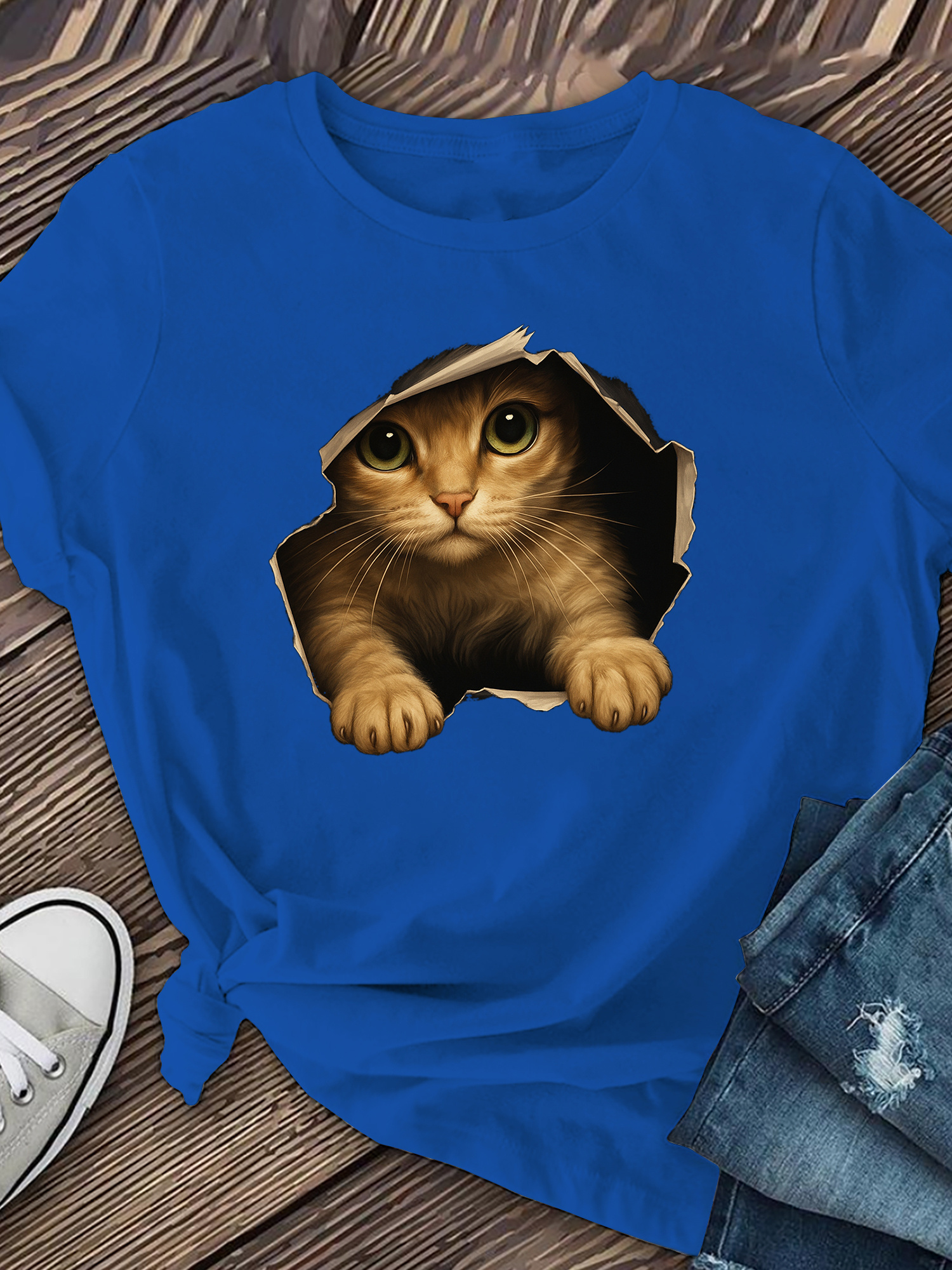 [Cute Orange Kitten T-Shirt] Lightweight Comfortable Fit Women's Cute Orange Kitten Peeking from Torn Hole Graphic T-Shirt - Red Casual Everyday Tee for Pet Lovers - Medium Elasticity Fabric Spring Summer Apparel