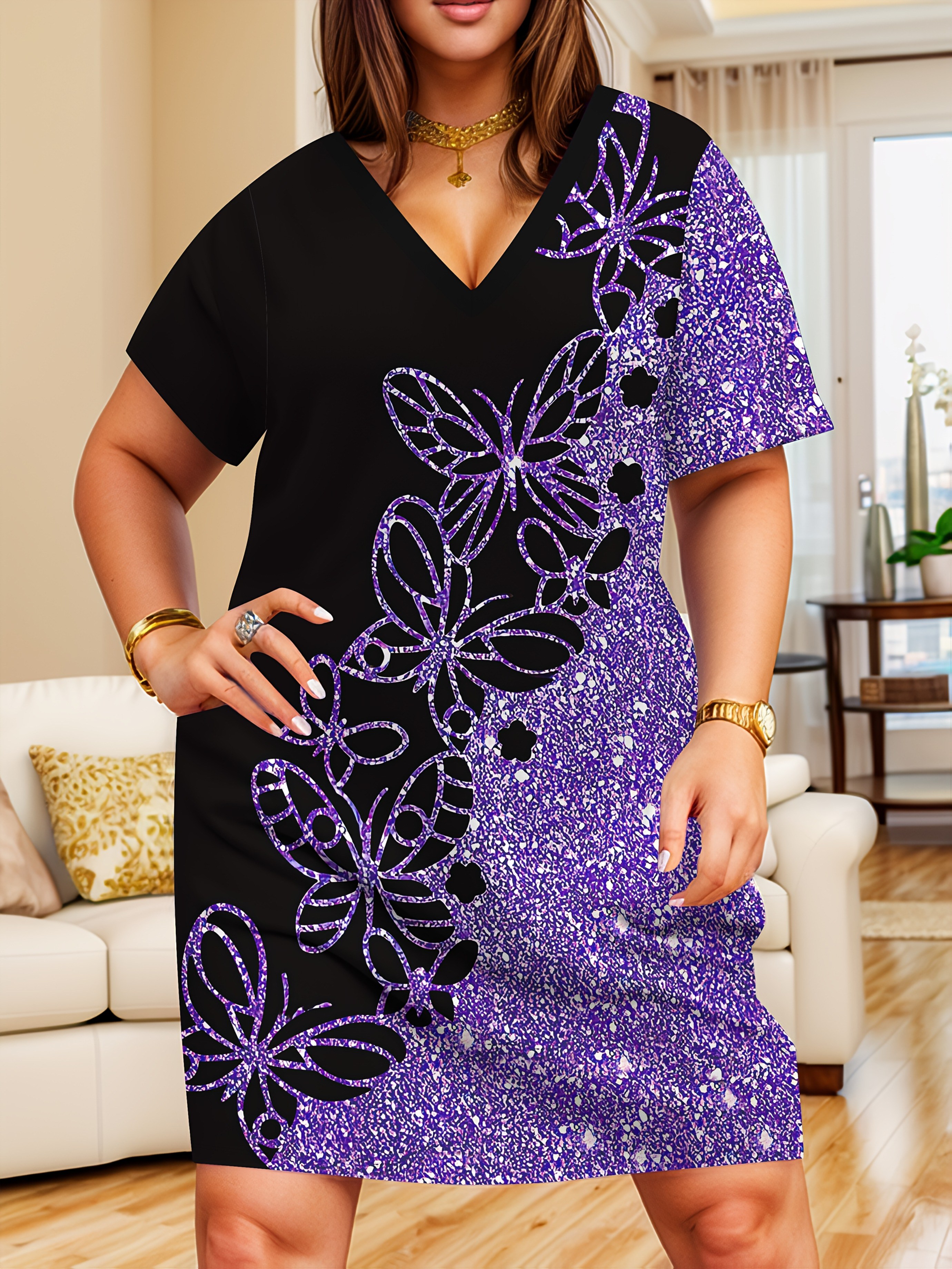 Ladies Elegant 3D Purple Glitter Butterfly Print V-Neck Short Sleeve Dress - Fit Stretch Black Purple Party Dress, Machine Washable, Suitable for Casual and Formal Settings, Comfort Edition