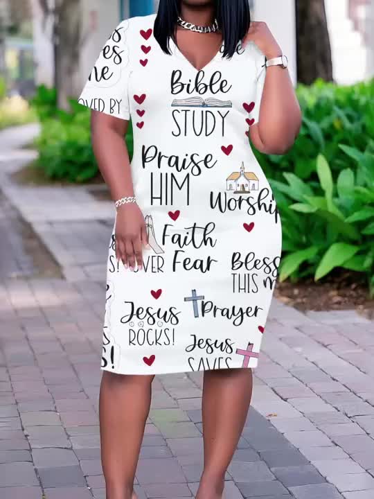 Plus Size Women's Christian Faith Dress - V-Neck Short Sleeve Church Dress with Verse Prints, Casual Loose Fit Short for Worship, Wedding Guest & Casual Attire (No Padding/)