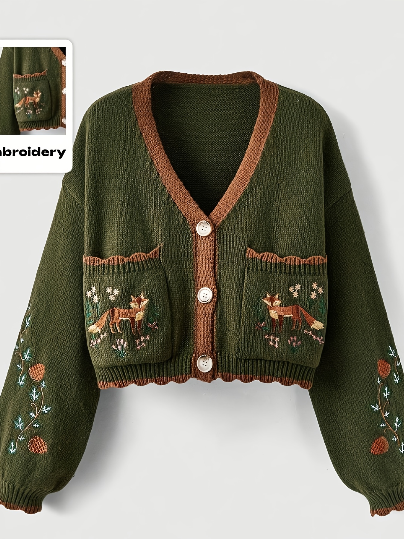[Plus Size Cardigan] Cozy Green Plus Size Women's V-Neck Cardigan | Long Sleeves, Front Buttons, Pockets, Floral & Animal Embroidery, Brown Trim | Winter Knit Outerwear, Stylish Button Closure, Detailed Embroidery