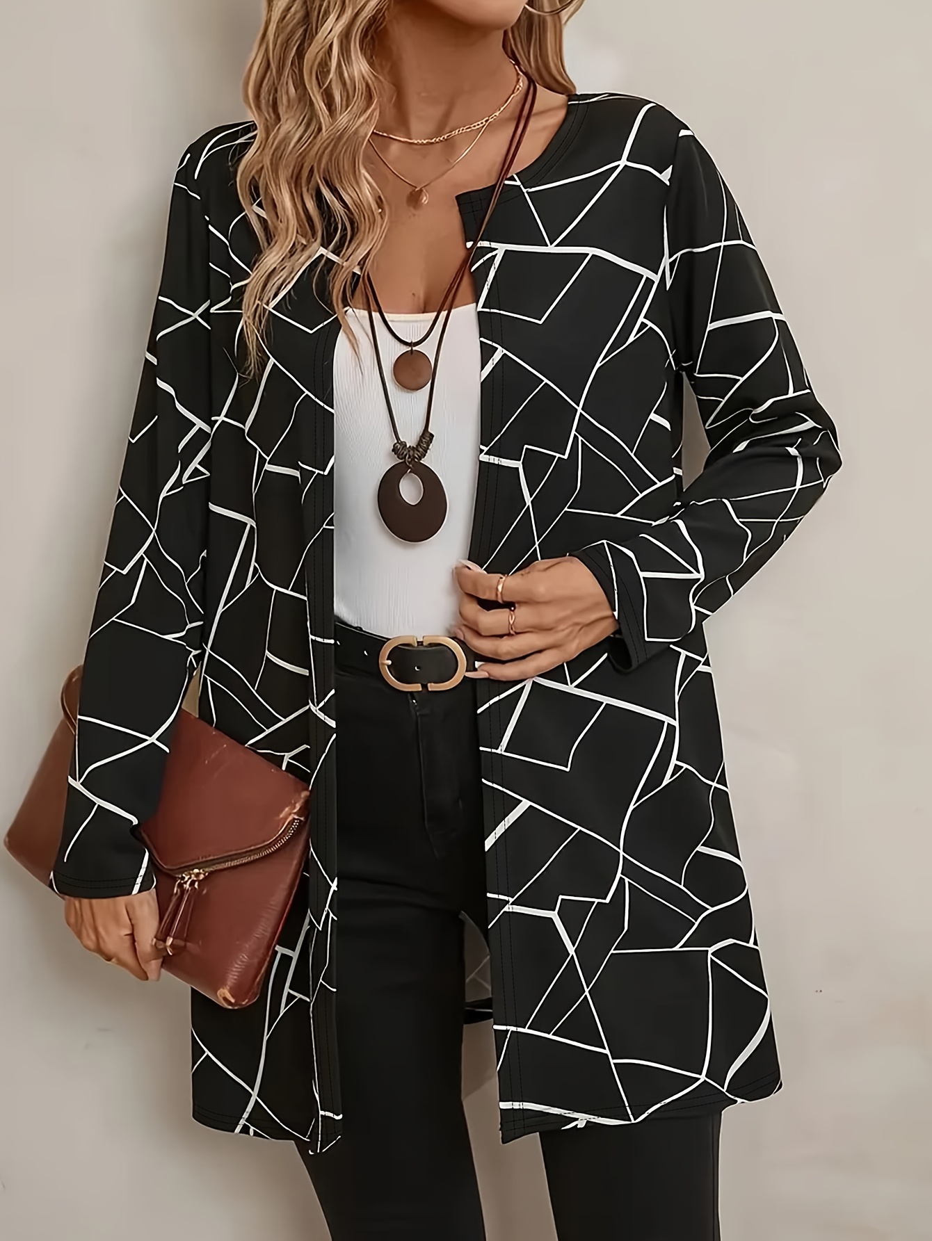 Plus Size - Plus Size Women'S Elegant Geometric Print Cardigan - Long Sleeve Open Front Jacket, Black & White Patterned Design, Casual Yet Stylish for Spring/Fall, Perfect for Commuting Or Casual Attire, Versatile Layering Piece | Elegant Open Front