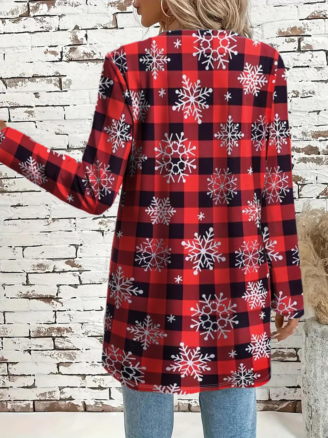 Plus Size, Plus Size Women's Red & Black Plaid Christmas Snowflake Cardigan Sweater - Soft Machine-Washable Winter Coat, Cozy -Free Jacket for Holiday & Casual Attire, Casual Winter Outfits (No Collar, Durable Plus Size Clothing)