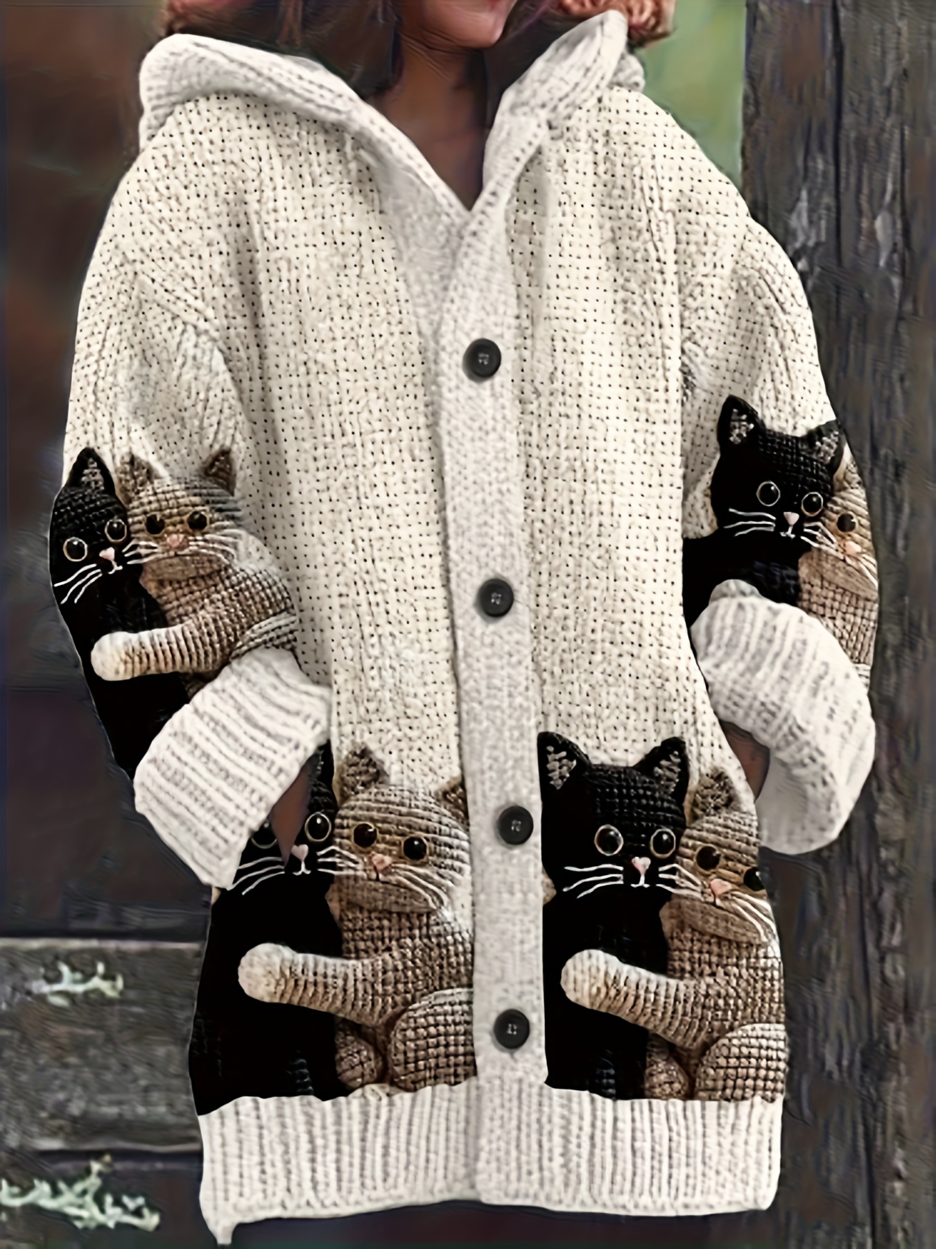 Plus Size, Women's Cozy 3D Cat Print Hooded Cardigan Sweater - Thick Winter Jacket with Front Pockets, Beige & Black Cat Design, Button-Front Closure, Long Sleeve All-Season Coat for Fall/Winter, Cat Lover Gift (Realistic Tabby/Tuxedo Patterns)