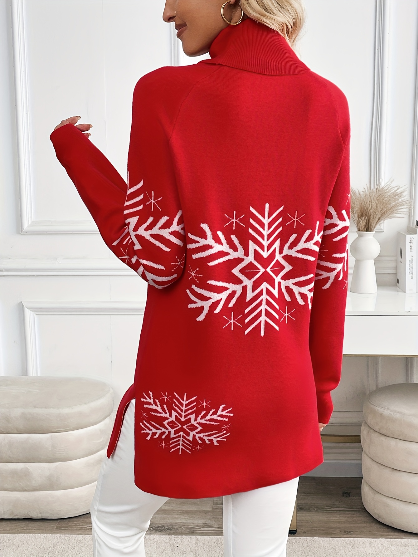 Women's Elegant Snowflake Christmas Sweater - High Neck Long Sleeve Red Winter Top, Festive Holiday Party Outfit, Cozy Winterwear Blouse