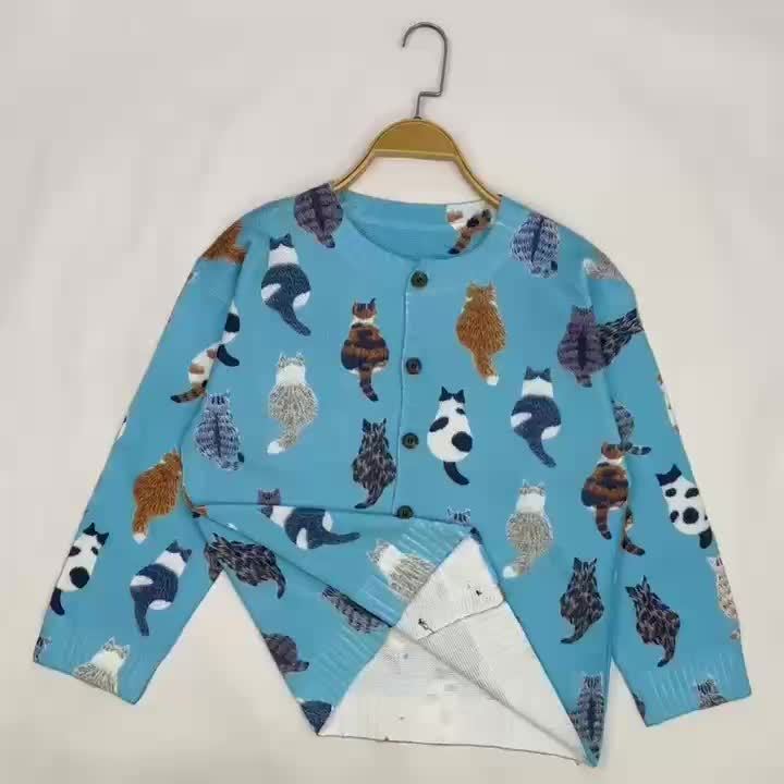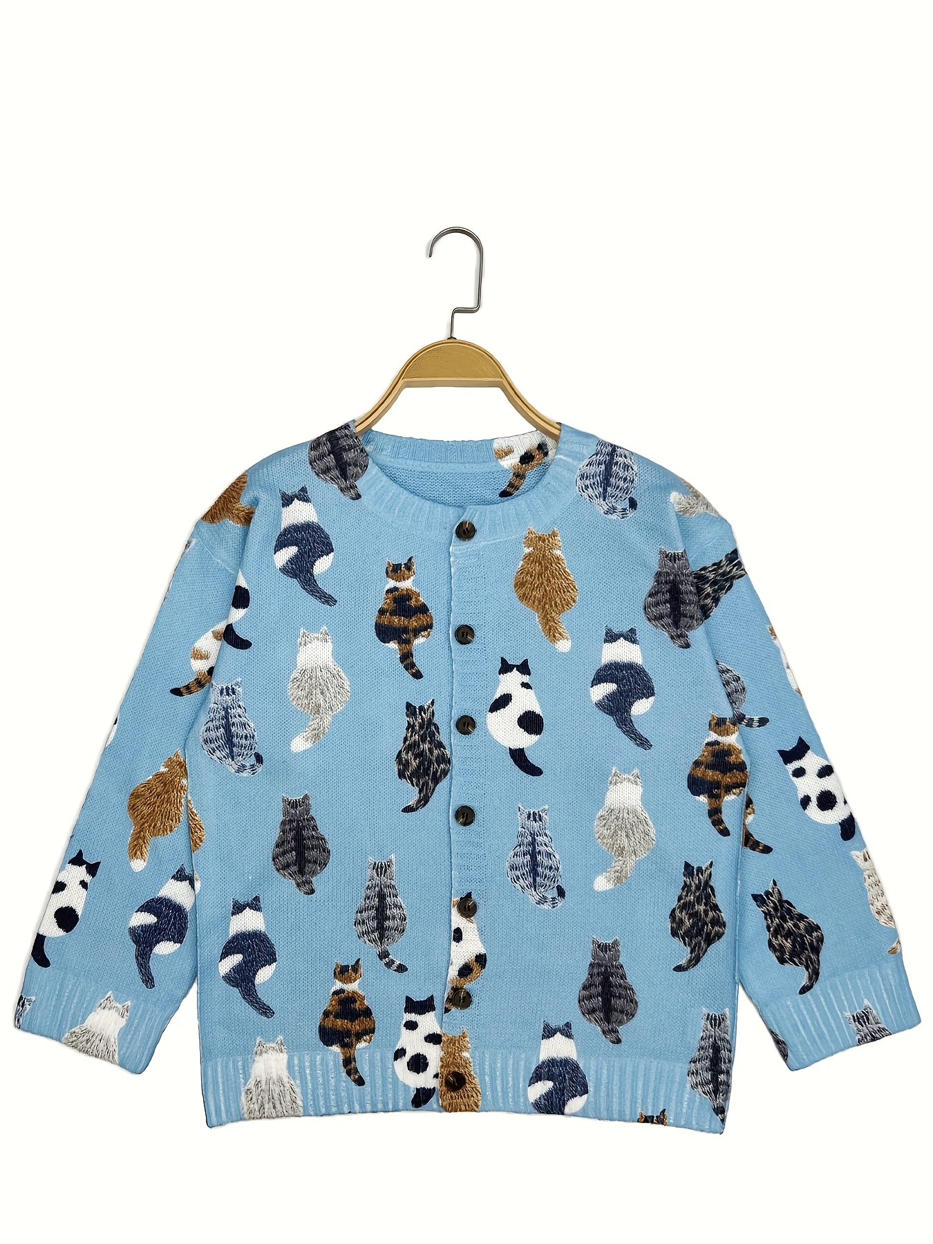Plus Size, Women's Plus Size Print Cardigan Jacket - Oversized Collar Long Sleeve Coat with Face & Paw Button Patterns, Spring/Fall Casual Outerwear (Turquoise) - Hand Washable Sweater for Large Women, -Themed Events & Everyday
