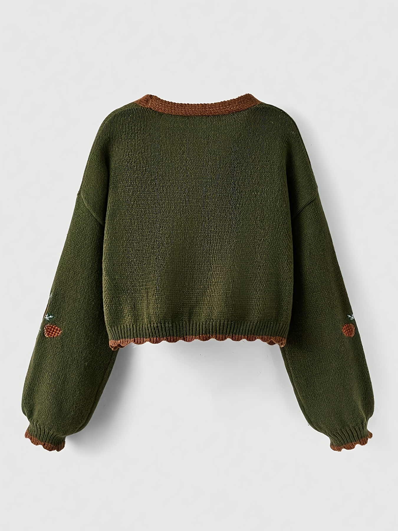 [Plus Size Cardigan] Cozy Green Plus Size Women's V-Neck Cardigan | Long Sleeves, Front Buttons, Pockets, Floral & Animal Embroidery, Brown Trim | Winter Knit Outerwear, Stylish Button Closure, Detailed Embroidery