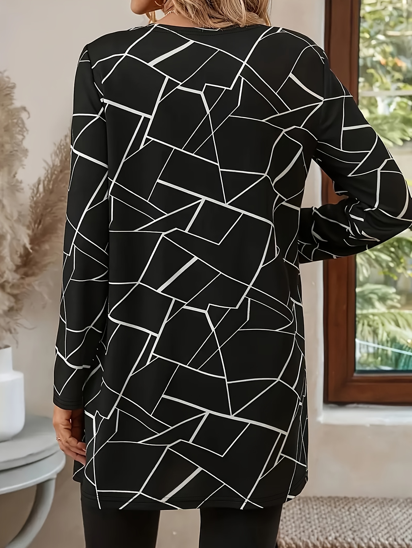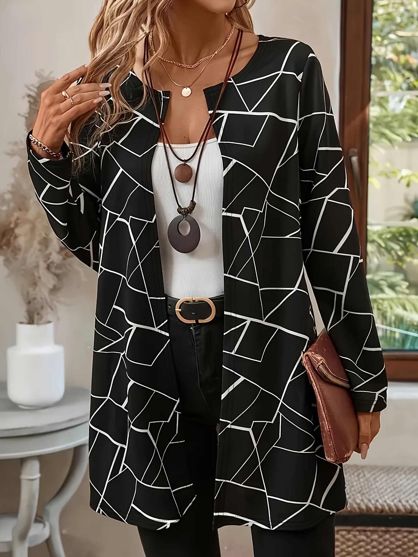 Plus Size - Plus Size Women'S Elegant Geometric Print Cardigan - Long Sleeve Open Front Jacket, Black & White Patterned Design, Casual Yet Stylish for Spring/Fall, Perfect for Commuting Or Casual Attire, Versatile Layering Piece | Elegant Open Front
