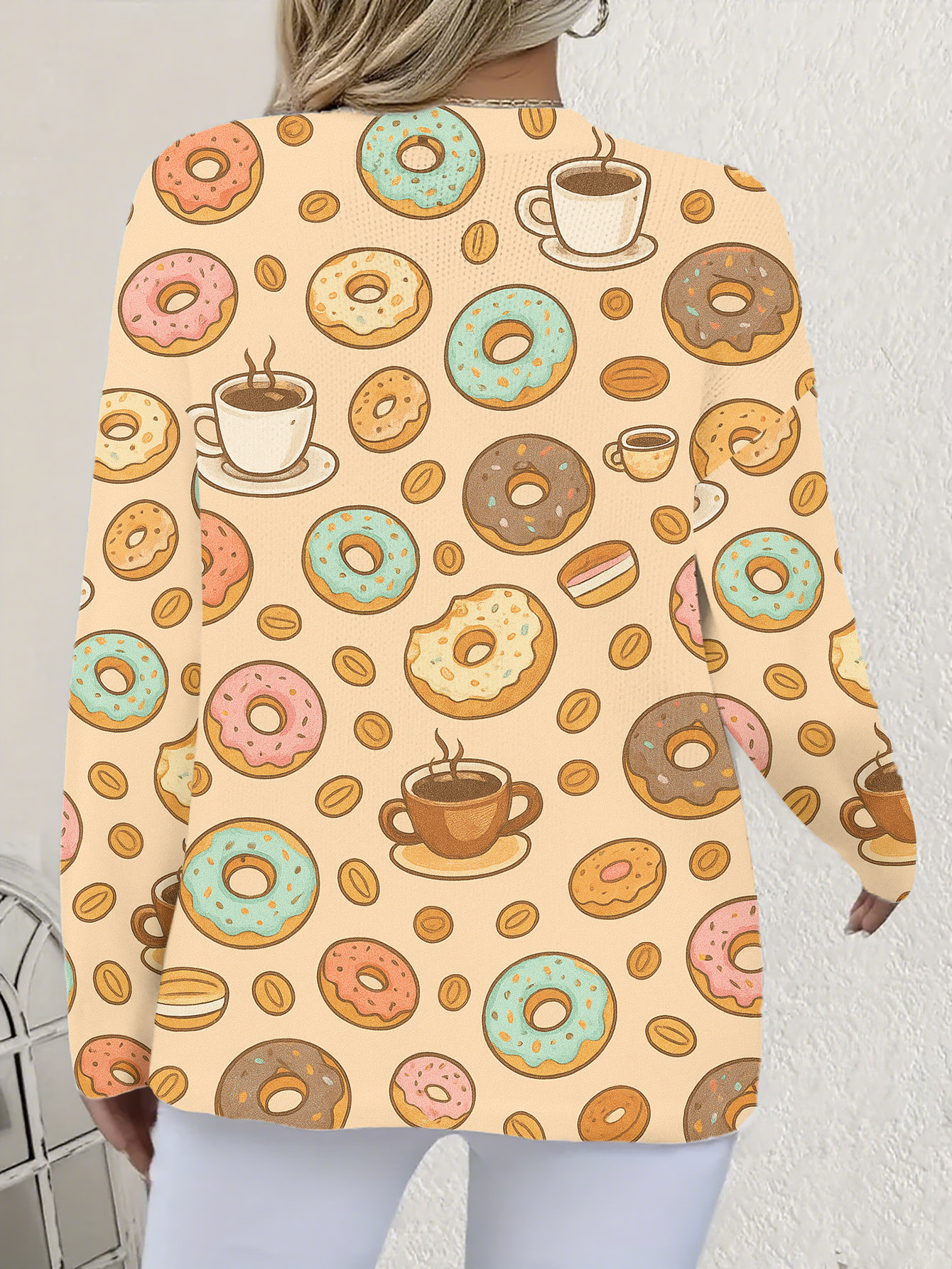 Plus Size, Plus Size Women's Kawaii Donut & Coffee Print Cardigan - Oversized Beige Jacket with Cute Dessert Buttons, Cozy Winter Sweater for Casual Outfits, Themed Parties & Dessert (Pink/Green/Blue/Yellow)