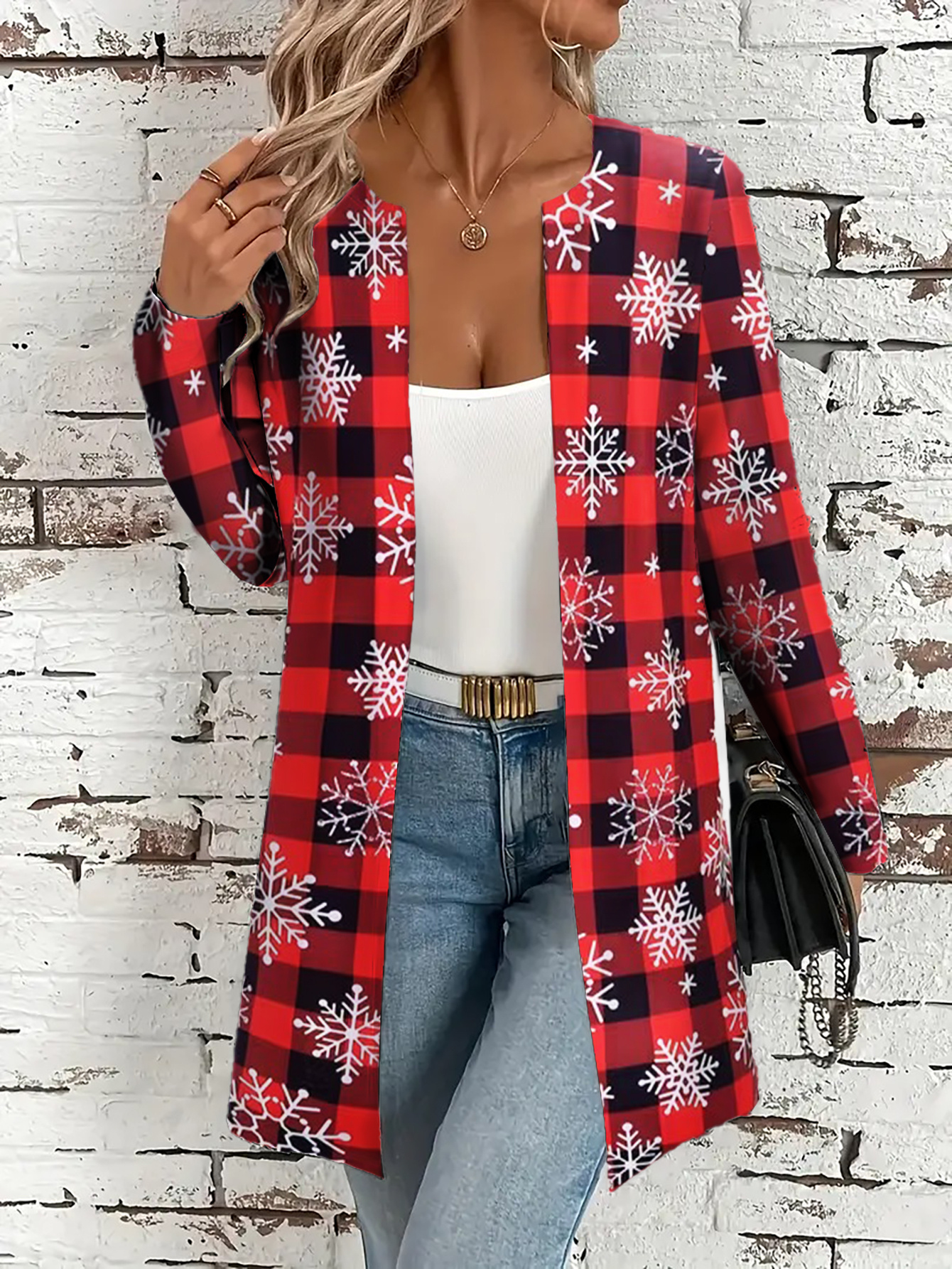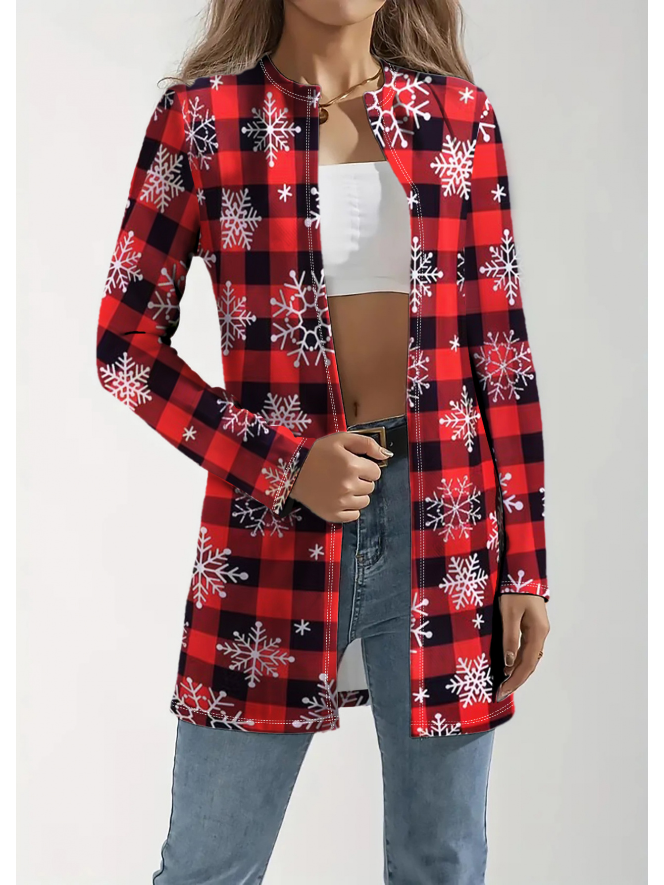 Plus Size, Plus Size Women's Red & Black Plaid Christmas Snowflake Cardigan Sweater - Soft Machine-Washable Winter Coat, Cozy -Free Jacket for Holiday & Casual Attire, Casual Winter Outfits (No Collar, Durable Plus Size Clothing)
