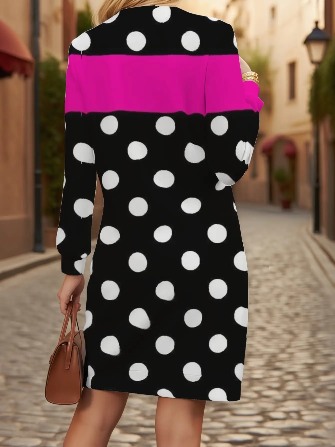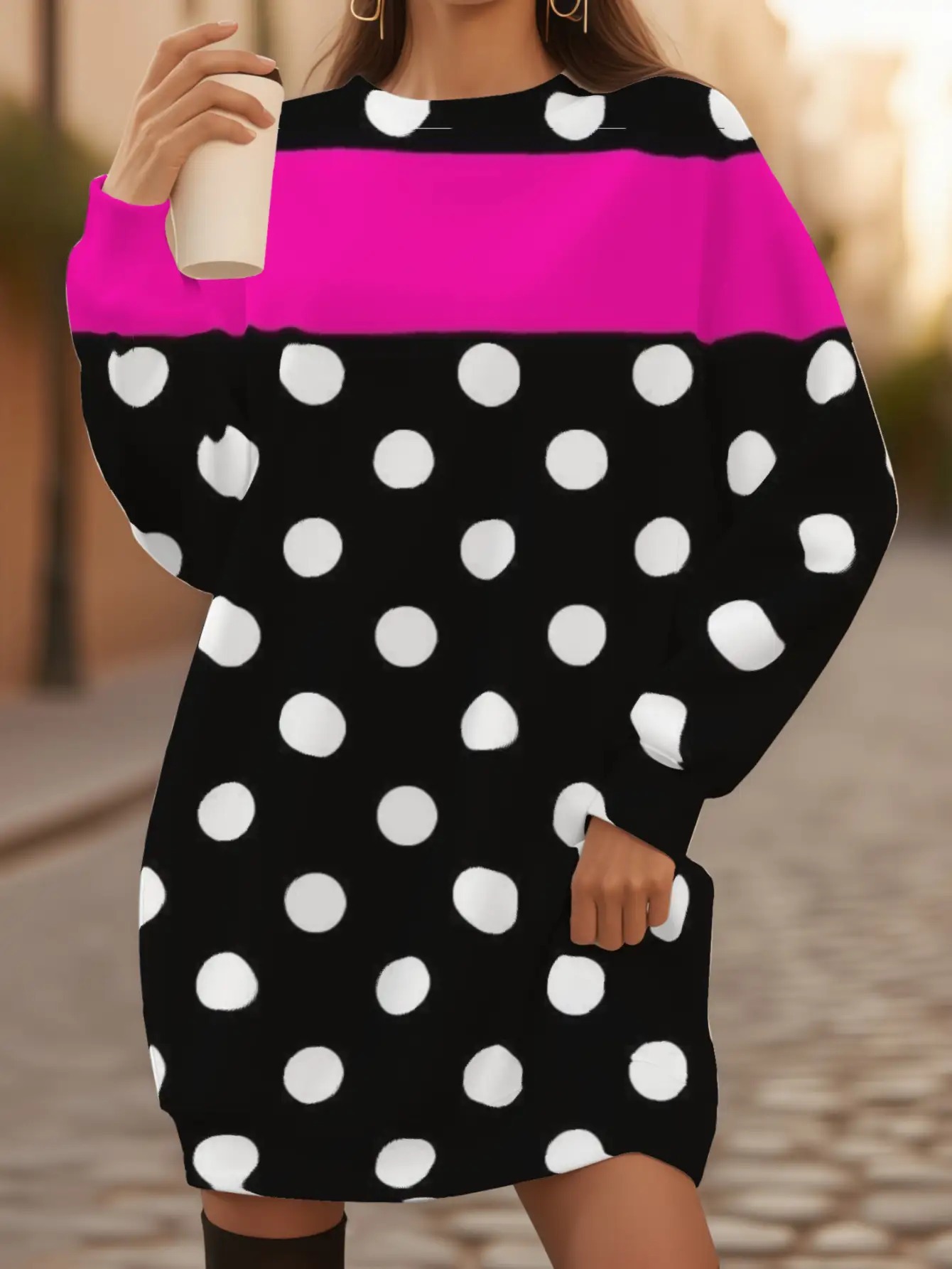 Women's Oversized Black & Pink Polka Dot Sweater - Tuxedo-Inspired Collar, Machine Washable Winter Coat Jacket, Loose-Fit All-Season Blazer for Casual & Formal Events, Pink & Black Digital Print Layering Piece