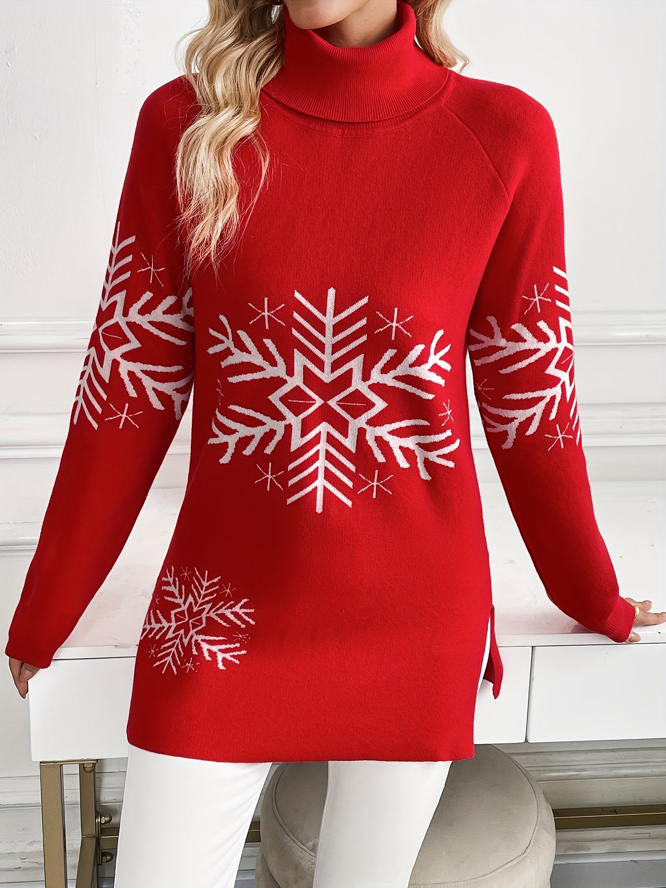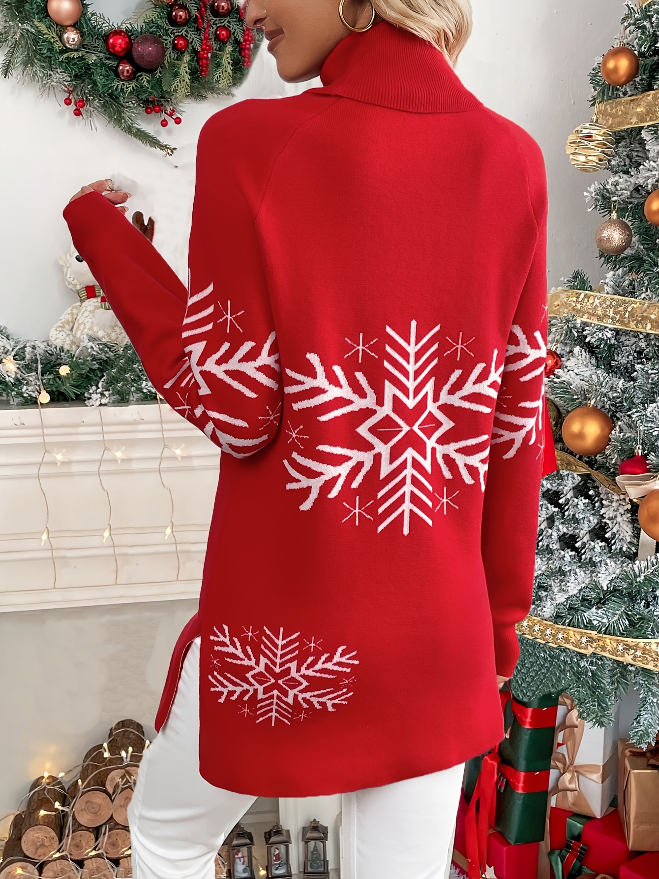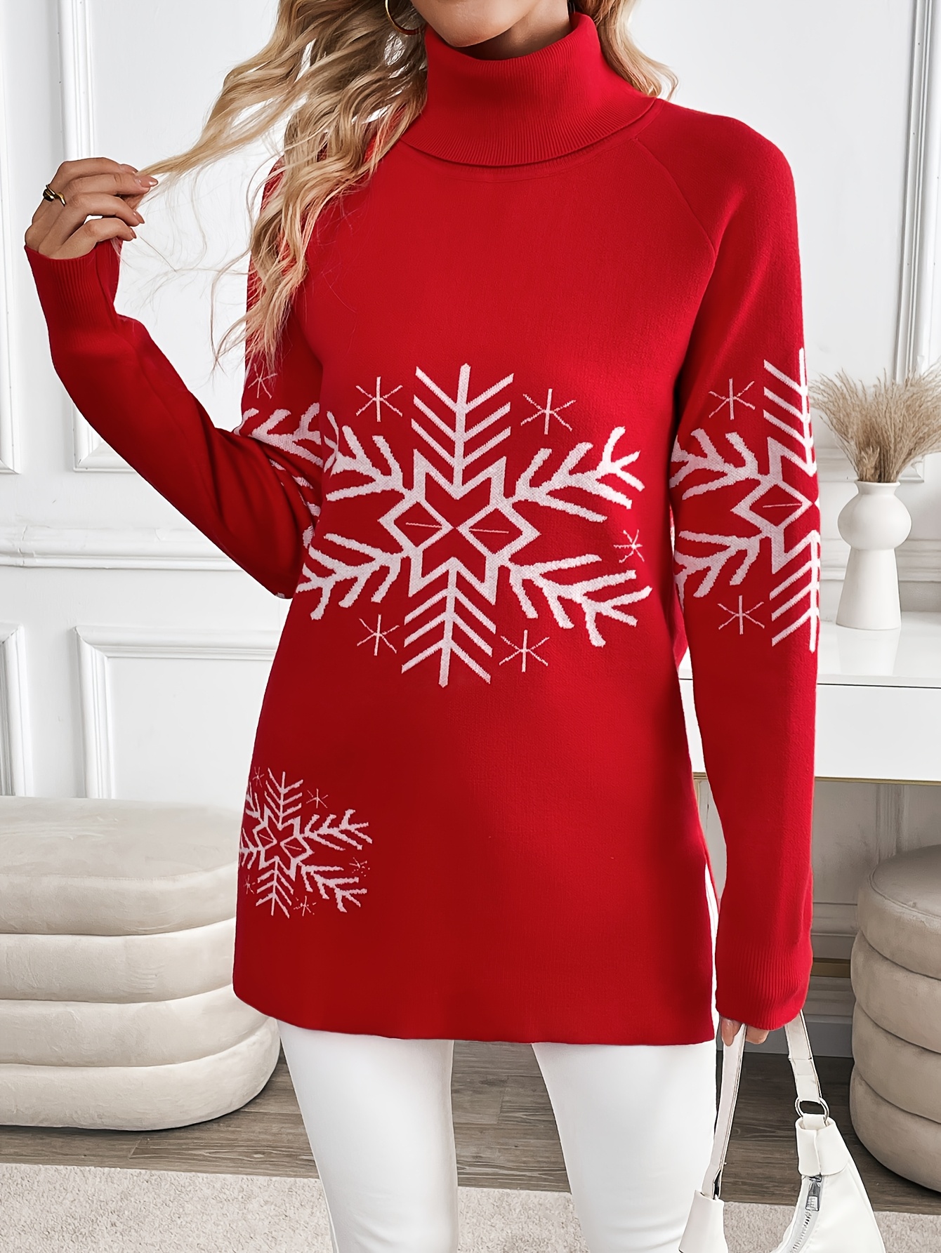 Women's Elegant Snowflake Christmas Sweater - High Neck Long Sleeve Red Winter Top, Festive Holiday Party Outfit, Cozy Winterwear Blouse